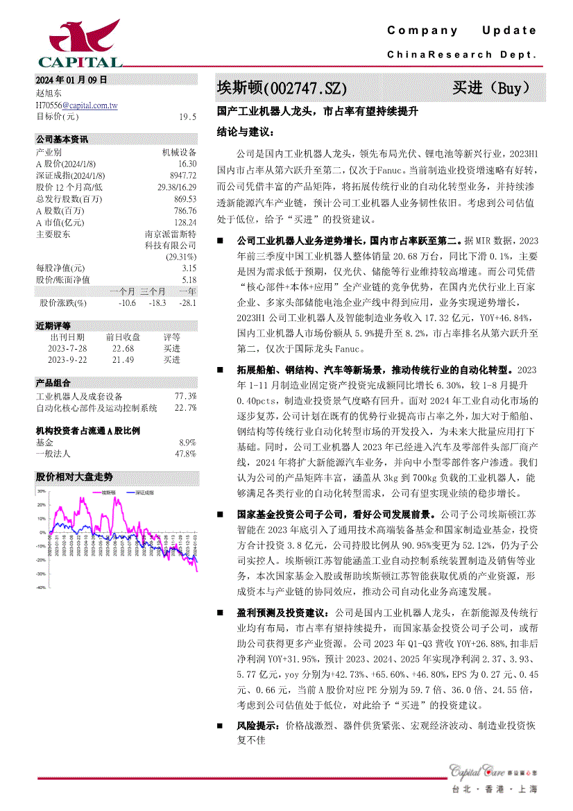 C o m p a n y U p d a t e C h i n a R e s e a r c h D e p t 。 阿2024年01月09日赵旭东方针价(元) 19。5 公司根基资讯财产别机械设备A股价(2024/1/8) 16。30 深证成指(2024/1/8) 8947。72 股价12个月高/低29。38/16。29 总刊行股数(百万) 869。53 A股数(百万) 786。76 A市值(亿元) 128。24 次要股东南京派雷斯特科技无限公司(29。31%) 每股净值(元) 3。15 股价/账面净值5。18 一个月三个月一年股价涨跌(%) -10。6 -18。3 -28。1 近期评等出刊日期2023-7-28 2023-9-22 前日收盘22。68 21。49 评等买进买进产物组合工业机械人及成套设备77。3% 从动化焦点部件及活动节制系统22。7% 机构投资者占畅通A股比例基金8。9% 一般法人47。8% 股价相对大盘走势埃斯顿(002747。SZ)买进(Buy) 国产工业机械人龙头,市占率无望持续提拔结论取:公司是国内工业机械人龙头,领先结构光伏、锂电池等新兴行业,2023H1国内市占率从第六跃升至第二,仅次于Fanuc。当前制制业投资增速略有好转,而公司凭仗丰硕的产物矩阵,将拓展保守行业的从动化转型营业,并持续渗入新能源汽车财产链,估计公司工业机械人营业韧性照旧。据MIR数据,同比下滑0。1%,次要是由于需求低于预期,仅光伏、储能等行业维持较高增速。而公司凭仗“焦点部件+本体+使用”全财产链的合作劣势,正在国内光伏行业上百家企业、多家头部储能电池企业产线中获得使用,营业实现逆势增加,2023H1公司工业机械人及智能制制营业收入17。32亿元,YOY+46。84%,国内工业机械人市场份额从5。9%提拔至8。2%,市占率排名从第六跃升至第二,仅次于国际龙头Fanuc。2023年1-11月制制业固定资产投资完成额同比增加6。30%,较1-8月提拔0。40pcts,制制业投资景气宇略有回升。面临2024年工业从动化市场的逐渐苏醒,公司打算正在既有的劣势行业提高市占率之外,加大对于船舶、钢布局等保守行业从动化转型市场的开辟投入,为将来多量量使用打下根本。同时,公司工业机械人2023年曾经进入汽车及零部件头部厂商产线年将扩大新能源汽车营业,并向中小型零部件客户渗入。我们认为公司的产物矩阵丰硕,涵盖从3kg到700kg负载的工业机械人,可以或许满脚各类行业的从动化转型需求,公司无望实现业绩的稳步增加。公司子公司埃斯顿江苏智能正在2023岁尾引入了通用手艺高端配备基金和国度制制业基金,投资方合计投资3。8亿元,公司持股比例从90。95%变动为52。12%,仍为子公司实控人。埃斯顿江苏智能涵盖工业从动节制系统安拆制制及发卖等营业,本次国度基金入股或帮帮埃斯顿江苏智能获取优良的财产资本,构成本钱取财产链的协同效应,鞭策公司从动化营业高速成长。盈利预测及投资:公司是国内工业机械人龙头,正在新能源及保守行业均有结构,市占率无望持续提拔,而国度基金投资公司子公司,或帮帮公司获得更多财产资本。群益证券()无限公司。不合错误此演讲之精确性及完整性做任何,或代表或做出任何书面,并且不会对此演讲之精确性及完整性负任何义务或权利。群益证券()无限公司,及其分公司及其联营公司大概正在收到此份演讲前利用或按照此份演讲之材料或研究保举做出任何步履。群益证券()无限公司及其任何之一位董事或其代表或雇员不会对利用此份演讲后招致之任何丧失负任何义务。群益证券()无限公司及其任何之一位董事或其代表或雇员或会对此份演讲内描述之证持看法或立场,或会买入,沽出或供给发卖或出价此份演讲内描述之证券。群益证券()无限公司及其分公司及其联营公司可能以其户口,或代他人之户口买卖此份演讲内描述之证。