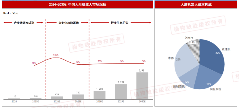 人形机械人成本形成:机械人焦点零部件次要包罗减速机、伺服电机、节制器等,此中减速机是机械人出产中壁垒最高的零部件。2024-2025财产链逐渐成熟:市场需求逐渐,手艺不竭冲破,手艺溢价逐渐衰退,保守工业机械人企业加快入局,鞭策手艺快速迭代取成本优化。2026-2027贸易化加快落地:规模化效应鞭策零部件成本下降,鞭策人形机械人的价钱下降,办事等场景的贸易化落地。2028-2030行业生态扩张:保守工业机械人企业、零部件供应商、AI算法公司等协同合做,财产链不竭完美,通用手艺平台和接口的成熟将降低开辟门槛,吸引更多新厂商进入。