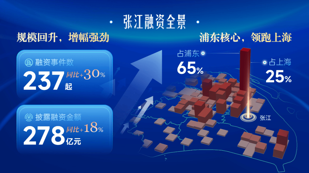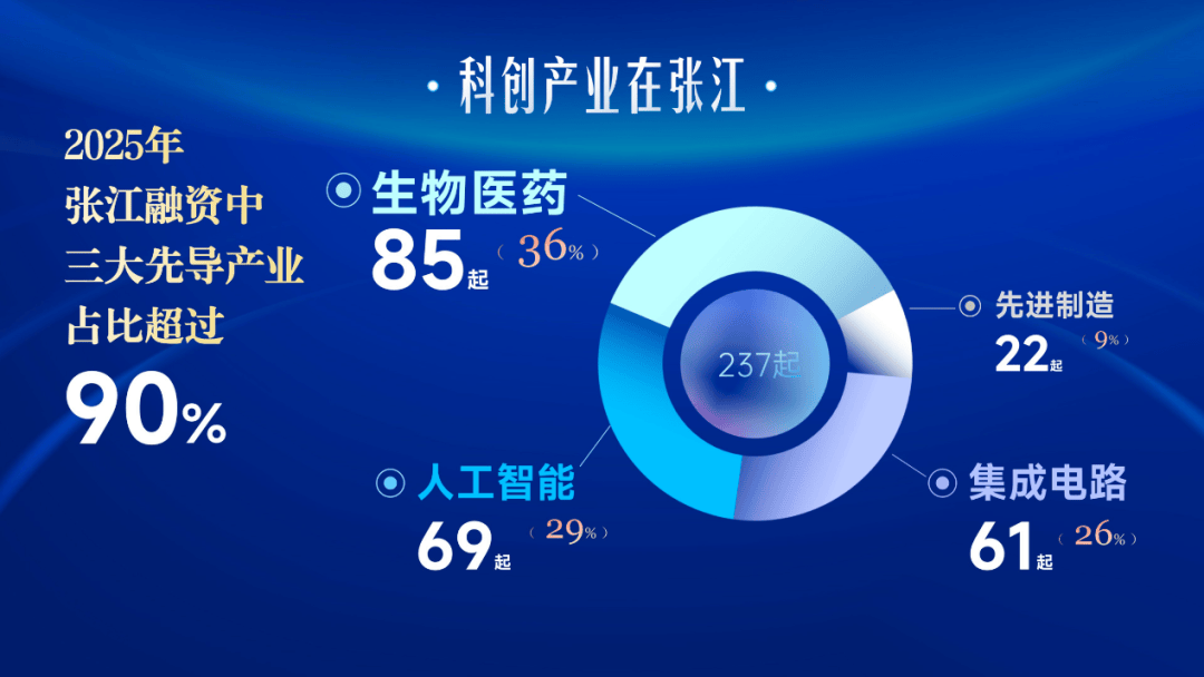 2025年,张江共有210家科创企业完成融资,全年发生237起融资事务,披露融资金额278亿元。正在全体一级市场仍然偏紧的布景下,张江融资规模取活跃度同步回升,融资事务数同比增加30%,披露融资金额同比增加18%。这种数量取金额的齐头并进,意味着市场正正在走出不雅望期,本钱取项目正从头高效对接,一条“修复曲线”已正在张江率先绘就。察看张江的全年表示,融资节拍呈现出高度的平衡性取持续性,未呈现阶段性的“冲量”或断档。平均每月约20起融资事务,反映出张江持续有项目正在推进、有投资正在落地。从区域贡献看,张江做为上海科创投融资焦点承载区的地位仍然不成撼动。2025年,张江融资规模约占浦东新区的65%,约占上海全市的25%。这意味着,上海每4起科创融资中,就有1起发生正在张江。正在上海加速多点结构、科创多核心加快成型的布景下,各区环绕各自劣势财产持续发力,融资分布更趋多元。但张江仍能不变维持高占比,背后是持久堆集构成的财产密度、科研资本、平台能力取本钱收集的分析成果。能够说,张江不只“承载”融资,更正在持续“出产”高质量项目供给,这是其连结焦点地位的底子缘由。张江对新质出产力的赋能效应显著,本钱向高手艺壁垒范畴集中的趋向愈发清晰。2025年,张江科创融资的行业投向更趋集中,生物医药、人工智能及集成电三大先导财产的融资合计占比达到91%,较2024年的82%进一步提拔。